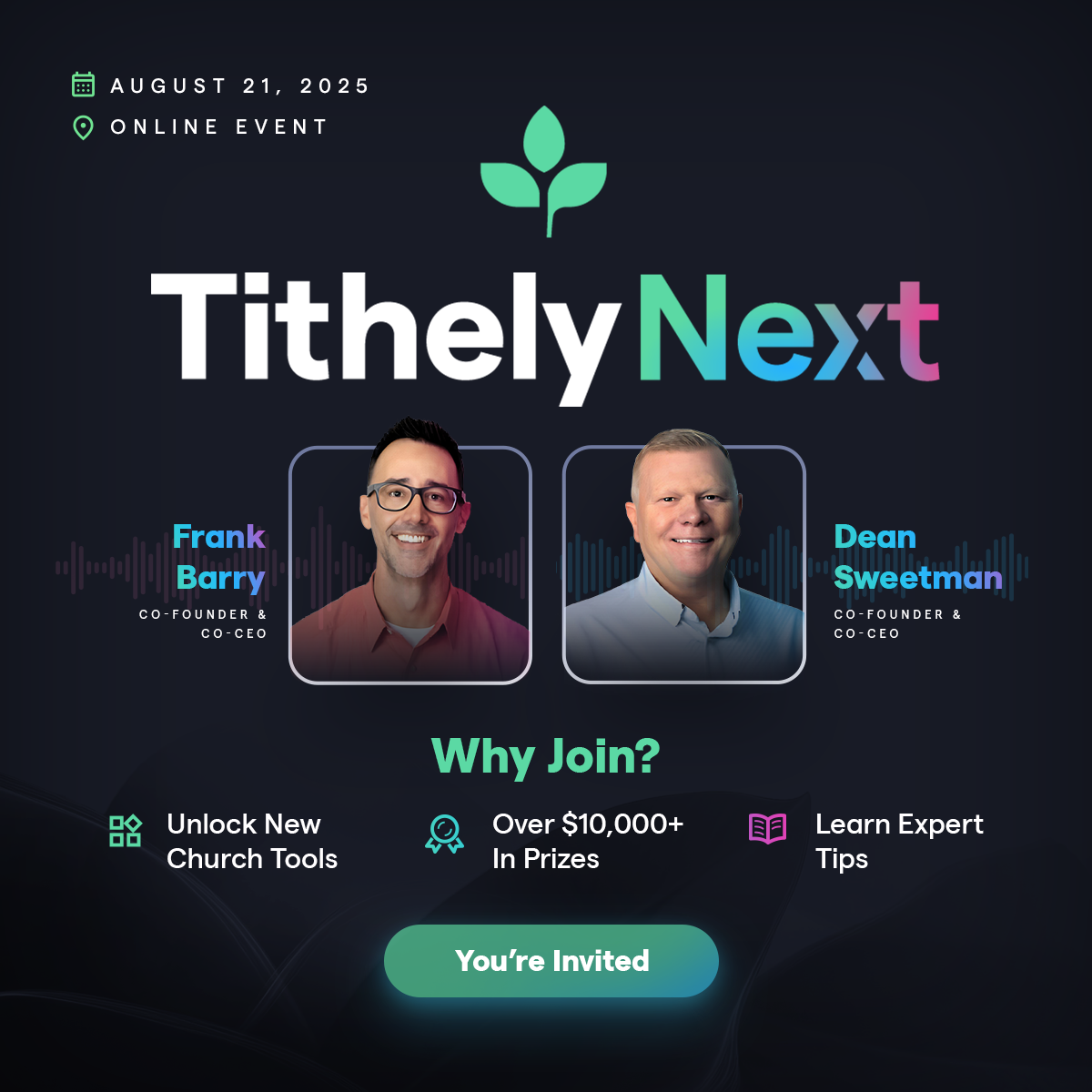 Tithely CEO Frank Barry and Co-Founder Dean Sweetman are back on stage—ready to share the story behind Tithely 3.0, our vision for the future, and why this moment matters for every church.